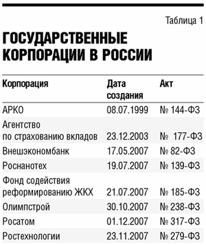 Вообще-то создание государственных корпораций началось не в прошлом году, а восемью годами ранее. Первая такая структура — Агентство по реструктуризации кредитных организаций (АРКО) — появилась в 1999 г. на основании поправки в Федеральный закон «О некоммерческих организациях», введенной принятым в июле того года Законом «О реструктуризации кредитных организаций». Кто помнит, тогда, после дефолта в 1998-м, надо было спасать банковскую систему. Так что случай был вынужденный и, можно сказать, благородный — недовольства появлением госкорпорации как новой организационно-правовой формы не припоминается.